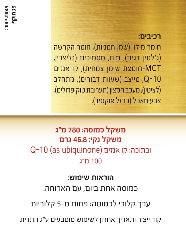 Q10 GOLD נחשב לחומר אשר מתפקד כחלק מהוויטמינים שיש לנו בגוף והוא לאנטי אוקסידנט ברמה גבוהה במיוחד. הוא שותף לתהליכי אנרגיה בגוף ונמצא בריכוזים גבוהים במוח, בכבד, בלב ובכליות. תוסף קו אנזים Q10 GOLD, מהווה יתרונות רבים והוא נקי מסוכרים, מלחים, גלוטן, צבעי מאכל וחומרים משמרים.