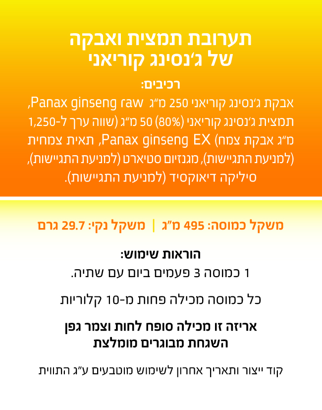 • הצריכה של ג׳ינסנג קוריאני, מסייעת להעלות את היכולות הגופניות ומייעל את היכולות שלנו בין אימון לאימון.