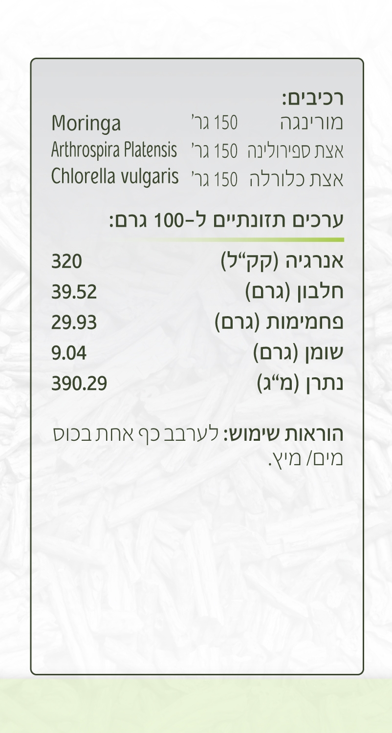 רבות כבר שמענו על מזונות הסופר פוד ועל יתרונותיו של כל סוג מזון בנפרד. חברת NUTRI D גאה להציג את השילוב המושלם של מספר מזונות על בפורמולה אחת ייחודית בעלת מיצוי אופטימלי וריכוז עוצמתי של כל הרכיבים אותם הם מכילים. שילוב של אצת הספירולינה, אצת הכלורלה וצמח המורינגה מחוללים לגוף פלאים הן מבחינה בריאותית, נפשית והן מבחינת המראה החיצוני שלנו והתחושות להן אנו זוכים.